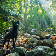 จากกระท่อมเดินทวนน้ำไปราวสองสามนาที ผ่านโขดหินใหญ่ เลี้ยวขวามาจะพบเจอหาดทรายหยาบๆ และผนังหินขนาดใหญ่ โค้งน้ำตรงนี้งดงามเสียจนอยากนอนหงายท้องมองฟ้าที่ต้นไม้เว้นช่องไว้ เสียงน้ำไหลระริกระรี้กระทบผนังหินที่เขียวชะอุ่มไปด้วยมอส-เฟิร์น ใต้น้ำใสมีปลาน้อยแหวกว่ายไปมา เป้ สีน้ำตั้งเฟรมวาดภาพลำห้วยที่เต็มไปด้วยโขดหิน สองข้างลำห้วยคือกอไผ่กลุ่มใหญ่ สายน้ำยังคงไหลริน อากาศเย็นชื้น ปลายพู่กันเคลื่อนไหวคล้ายสายน้ำ